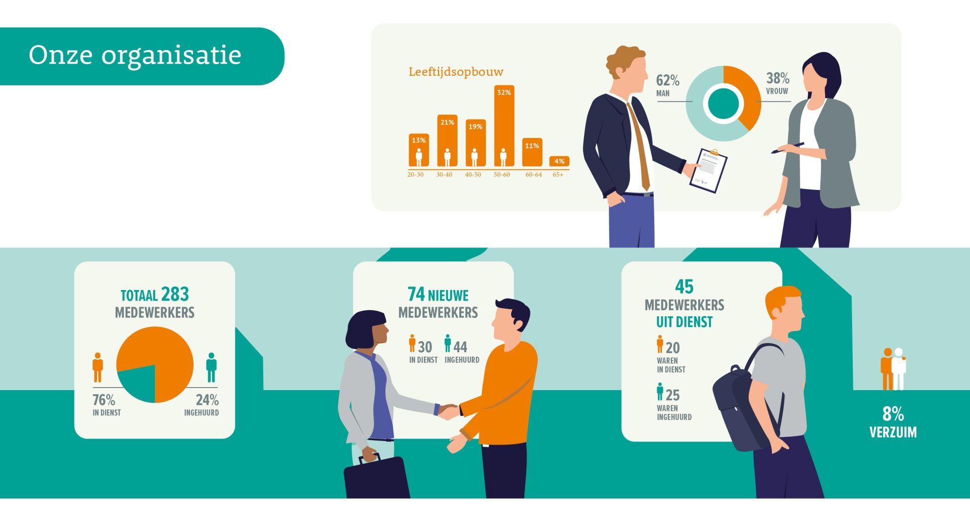 - Van onze medewerkers was 62% man en 38% vrouw.